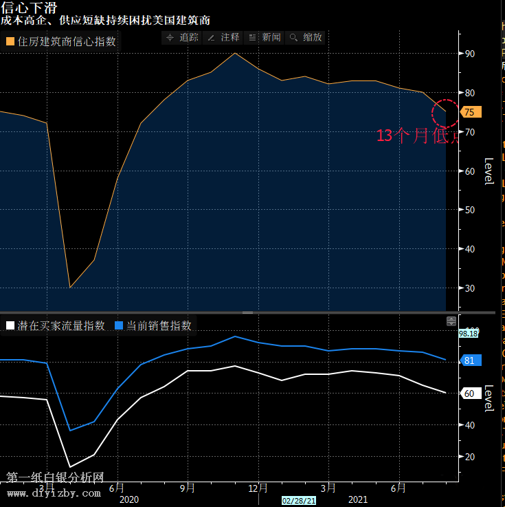 由于價格和成本居高不下,供應持續(xù)短缺,美國住宅建筑商信心指數(shù)8月份跌至13個月低點。根據全國住宅建筑商協(xié)會(NAHB)/富國銀行周二發(fā)布的數(shù)據,衡量建筑商信心的指數(shù)連續(xù)第三個月下降,從7月的80降至75,為2020年4月以來的最大降幅。彭博社調查的經濟學家預計中值持平于80。