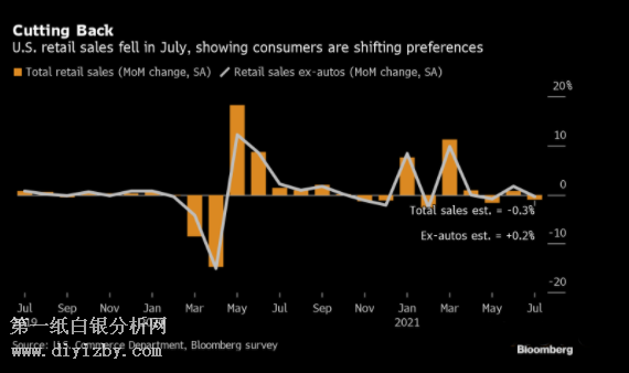 Delta變異病毒的出現(xiàn)對經濟活動構成風險,并可能抑制對旅游、娛樂和其他服務的需求。零售數(shù)據顯示,第三季度消費者支出增長放緩。經濟學家預測,本季度支出將以4.5%的年化增長率增長,遠低于一個月前的預計增長率,并從第二季度的11.8%大幅下降。