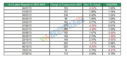 白銀價格走勢改變了方向并且在上個周開始出現(xiàn)下跌。那么白銀市場短期會出現(xiàn)什么樣的情況呢?讓我們來看一下最近可能會對白銀價格產(chǎn)生影響的新聞。 最近白銀價格的下跌反應(yīng)了在白銀ETFs中需求的下降,例如:白銀信托。在上個周,白銀信托價格下降了3個百分點。白銀相關(guān)方面的投資例如Silver Wheaton (SLW)同樣在上周下跌了1.2個百分點。著眼未來,美元的上漲,黃金價格還有美國經(jīng)濟的發(fā)展都可能會對白銀的價格產(chǎn)生影響。讓我們進一步探討一下這些問題吧。 這周美國非農(nóng)就業(yè)數(shù)據(jù)將會發(fā)布。這些報告似乎對白銀價格短期會產(chǎn)生影響。在前一份報告中,只有111300份工作在一月份被創(chuàng)造,而這一數(shù)據(jù)是在預(yù)測的數(shù)據(jù)之下。下表顯示的就是白銀價格的變化還有美元兌日元以及就業(yè)方面增長的關(guān)系。